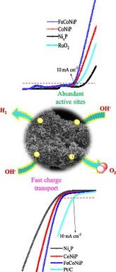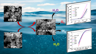 B,N co-doped V2C nanoparticle embedded FeP nanoflake substrates as unique bifunctional electrocatalysts for overall water splitting in alkaline media.