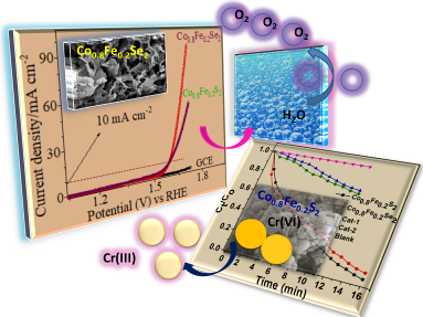 Template free-synthesis of cobalt-iron chalcogenides [Co0.8Fe0.2L2, L = S, Se] and their robust bifunctional electrocatalysis for the water splitting reaction and Cr(vi) reduction.